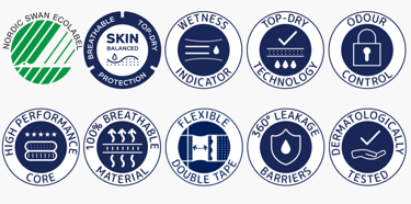 Διαθέτει 3 κανάλια διανομής υγρών για άμεση απορρόφηση και προστασία. Είναι εργονομικά σχεδιασμένο και πλήρως αναπνεόμενο. Το τέντωμα προσφέρει ελευθερία κινήσεων και υψηλό επίπεδο άνεσης. Τα διπλά φράγματα που διαθέτει, βελτιώνουν την προστασία από τις διαρροές και προσφέρουν ασφαλή εφαρμογή. Αόρατη αξιοπιστία και ανώτερη προστασία από οσμές (έως και 12 ώρες).