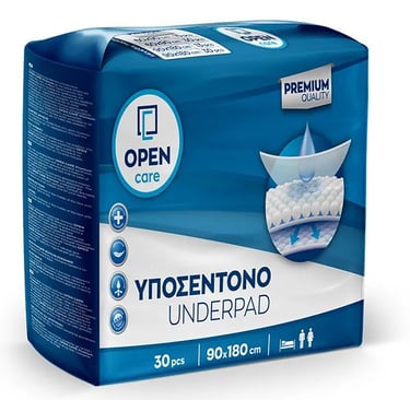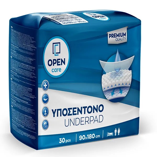 Τα νέα υπεραπορροφητικά υποσέντονα Open Care Premium με την extra απαλή και ανθεκτική τους σύνθεση προστατεύουν την επιδερμίδα από υγρασία και ερεθισμούς και εξασφαλίζουν την ευχάριστη διαμονή στο κρεβάτι ακόμη και σε περίπτωση συνεχούς κατάκλισης. Η αδιάβροχη επένδυση αλλά και το extra απορροφητικό στρώμα χαρτόμαζας επιτρέπουν την μεγαλύτερη δυνατή απορρόφηση υγρών. Τα νέα υποσέντονα Open Care Premium διατίθενται σε 4 συσκευασίες.
