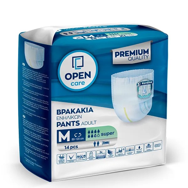 Το Βρακάκι Ενηλίκων Open Care αποτελεί προϊόν μιας χρήσης και είναι σχεδιασμένο για την ακράτεια. Απορροφά αποτελεσματικά την υγρασία και προσφέρει άνεση και προστασία που διαρκεί.